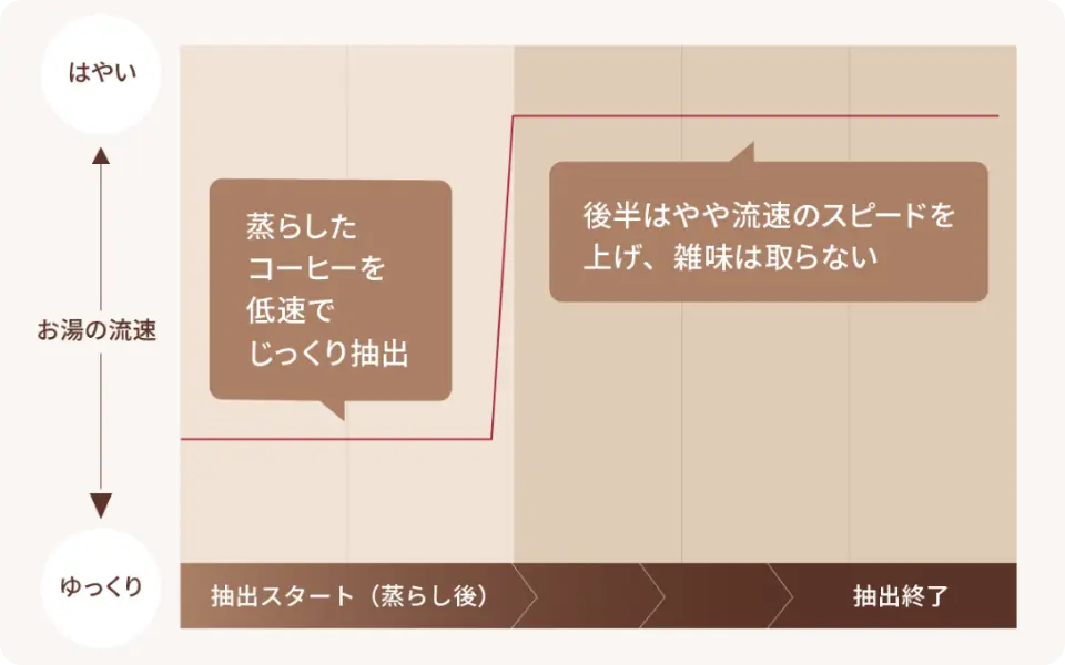 ※流速調整、蒸らしの強化、抽出スピードの繰り返し変化により濃厚なコクや香りを実現しました。