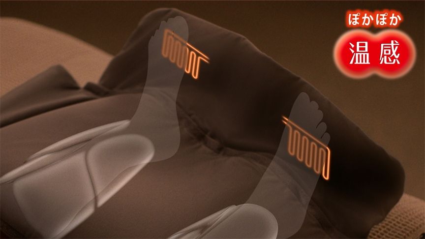 足先に温感(ヒーター)搭載。温感(ヒーター)はON/OFFができます。また、お好みに合わせて高温(約40℃)、低温(約37℃)の2段階の選択が可能です。また、独立しているので、温感だけでも使えて60分の自動オフ機能付きです。