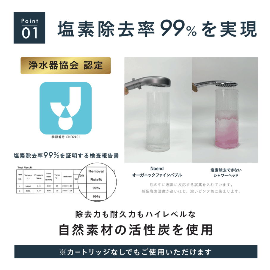 一般的に塩素除去フィルターには亜硫酸カルシウムが使用されることが多いですが、Noendは素材までこだわり自然素材の活性炭を採用しています。活性炭は亜硫酸カルシウムフィルターと比較し、10倍の耐久力と3倍の塩素除去率を発揮。(Noend社調べ)